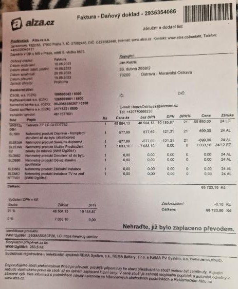 Nabízím k prodeji OLED TV LG, konkrétně: LG OLED 77B23PLA - 177 cm úhlopříčka, koupena v Alze dne 16.6.2023 za 65 723 Kč s prodlouženou zárukou o 2 roky, tj. TV je v záruce do 16.6.2027!